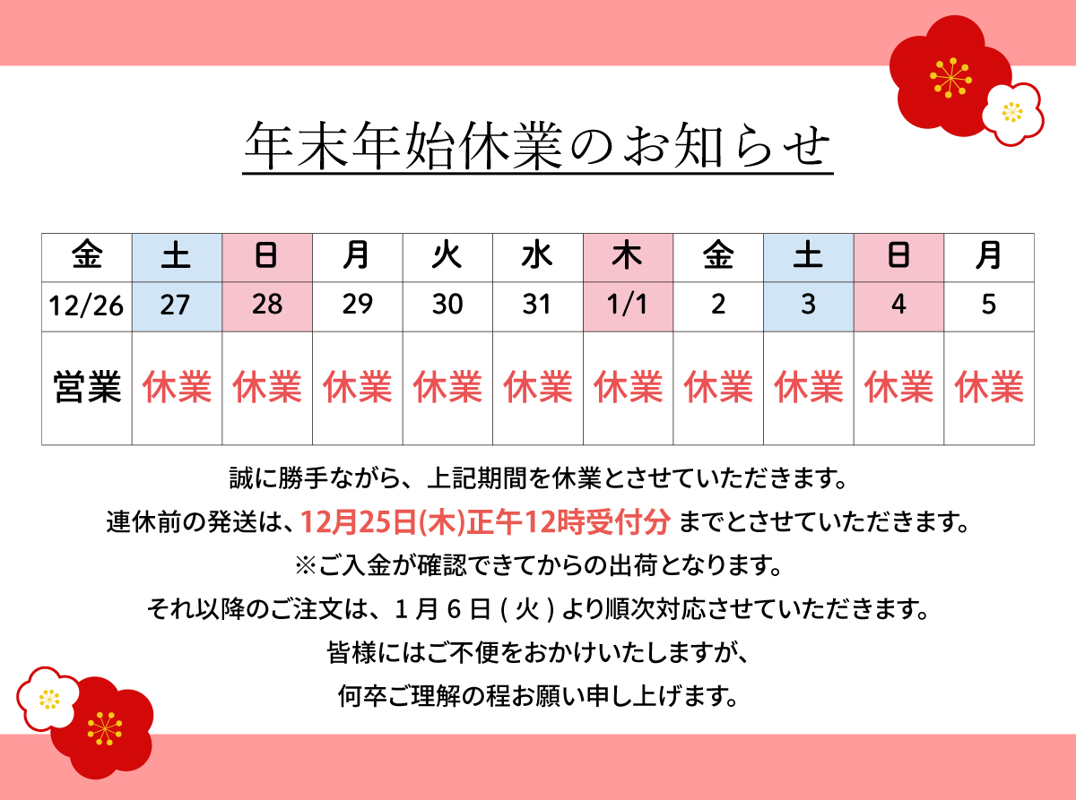 2025年12月27日(土)~2026年1月5日(月)は年末年始休業とさせていただきます。