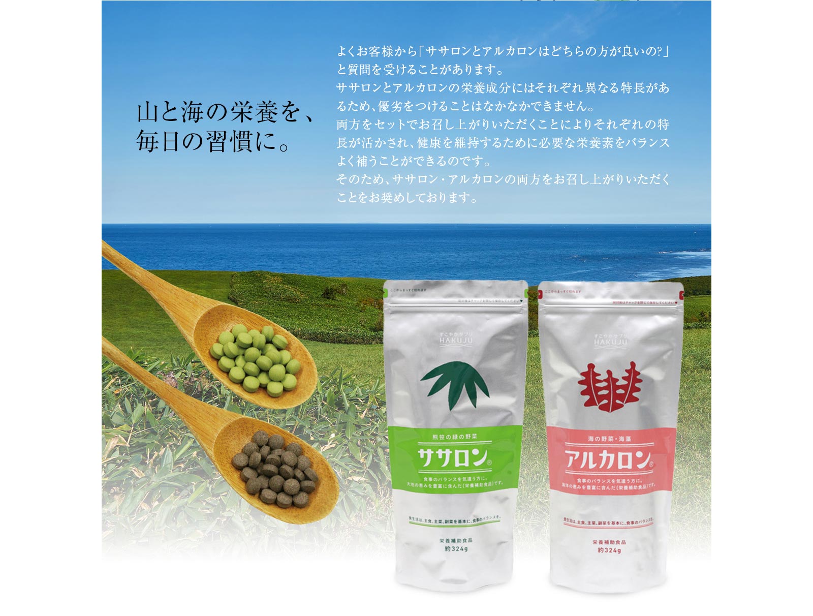 海藻を主原料とした水溶性食物繊維を豊富に含むアルカロン約324g入り(約2ヶ月分)。カルシウムやマグネシム、鉄分などのミネラル成分や、ビタミンA、B群などもバランス良く含んでおり、アルギン酸やフコイダンといった機能性成分を含みます。