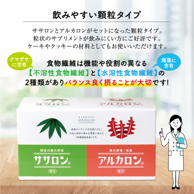 不溶性と水溶性2種類の食物繊維サプリ ササロン・アルカロン顆粒 1包2g×各60包 約30日分。粒を飲むのが苦手な方にご好評。ケーキやクッキーの材料としてもお使いいただけます。