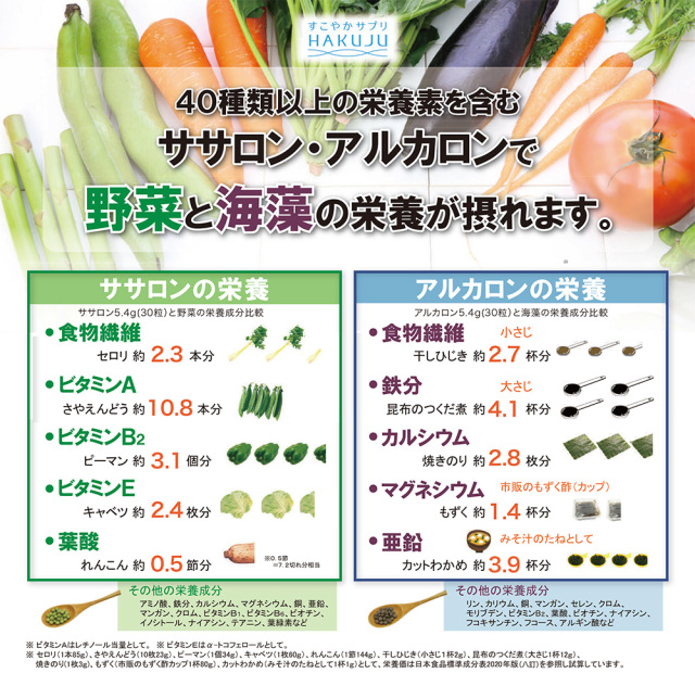 ミネラル成分を含む海藻、天然のカジメ・ヒジキ・ワカメ・アラメ・のり・コンブを原料とした「海の野菜」です。水溶性食物繊維を豊富に含み、生命維持に欠かせないカルシウムやマグネシウム、鉄分などのミネラル成分をバランスよく含んでおります。