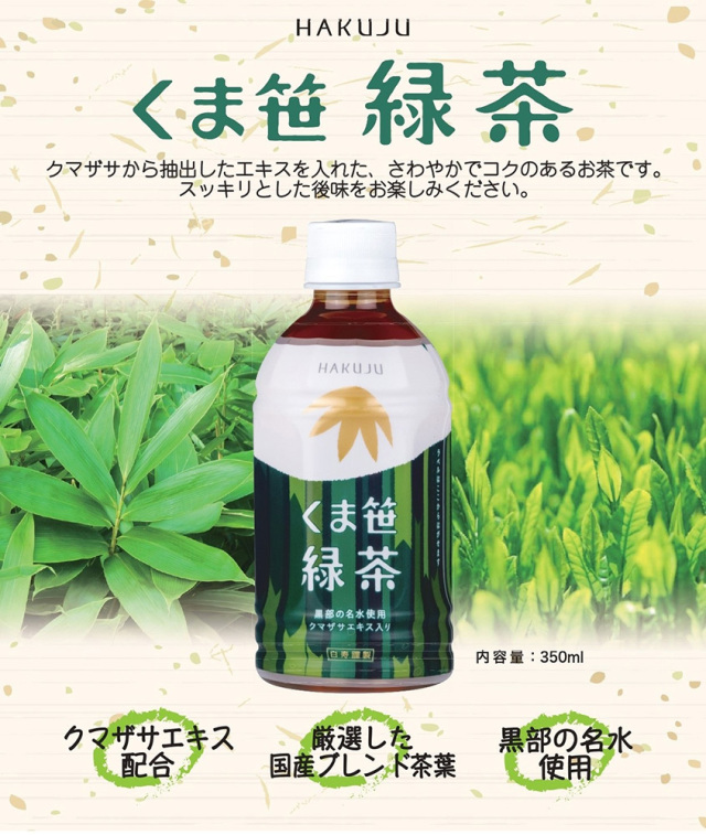 黒部の名水×厳選茶葉×クマザサ。クマザサエキス配合の緑茶。クマザサと相性の良い国産茶葉を厳選。さらに、お茶の命でもある水は黒部の名水を使用した、さわやかでコクのある白寿こだわりのドリンクです。持ち運びに便利なペットボトル入り。