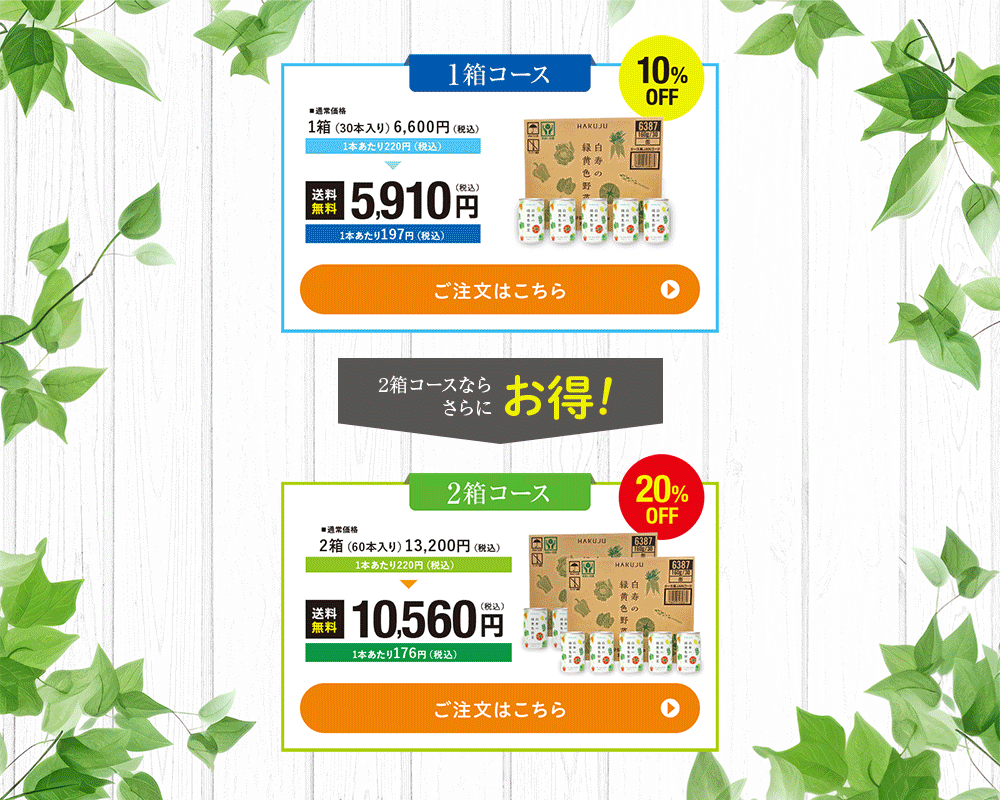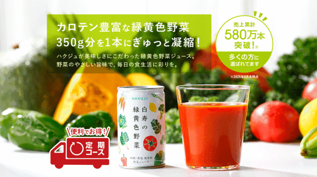 毎日美味しい白寿の緑黄色野菜を続けて飲んでみようとお考えの方へ。1年で12回分利用の場合、最大8,280円お得に!白寿の緑黄色野菜 30本入(1箱)を1ヶ月又は2ヶ月ごとにお届けします毎日野菜をとることが、健康づくりを支えます。美味しい野菜で、心も体も満たされる健康生活をお過ごしください。