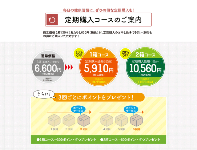 | ・ご注文時、お届けのサイクルと日付をお選びください。 サイクル:「1ヶ月ごと」または「2ヶ月ごと」 日付:「7日」「15日」「23日」「31日」からお選びいただけます。 「31日」をお選びいただいた場合、31日が存在しない月は月末にお届けいたします。 ・初回お届けはご注文後6日以降となります。 例)日付で「15日」をお選びいただいた場合、9日までのご注文が当月15日のお届けとなります。 ・次の受注から保有している全ポイントを自動で利用するかしないか選択できます。 「マイページ」より変更も可能です。 ・価格は1回のお届けあたりの金額となります。毎回30本(1箱30本)お届けします。 ・3回ごとに特典として300ポイントが加算されます。 ・1年で12回分利用の場合、最大8,280円お得です。更に上記1200ポイントが加算されます。 ・継続がお得なサービスです。4回目以降「マイページ」より解約が可能です。 ・解約・休止のお手続きは、次回お届け予定日の10日前までにお願いいたします。 ・定期購入コースのご利用には会員登録が必要です。 ・定期コースの商品とその他の商品の同梱は承れません。 ◎毎日の健康生活、始めませんか。 詳しくはこちら☞ |