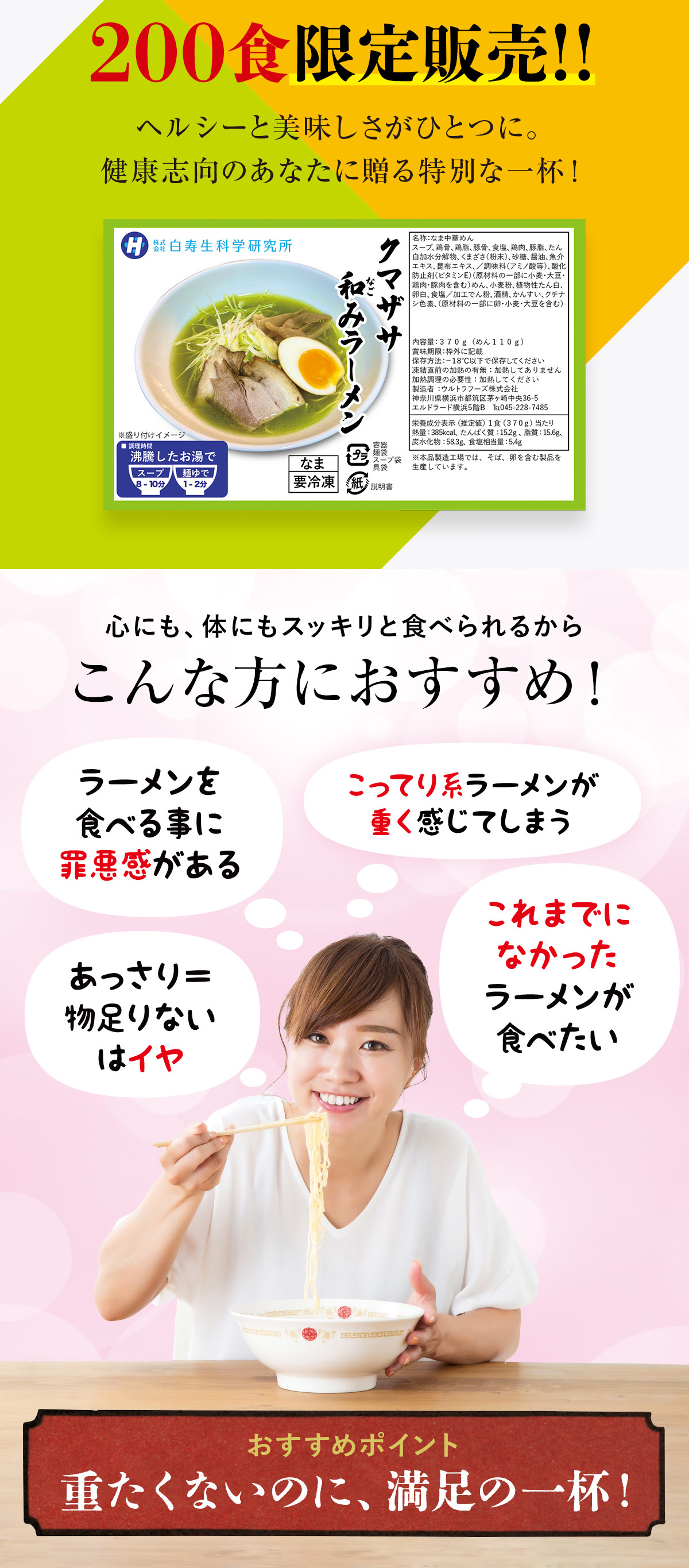 | 原材料 | スープ:鶏骨、鶏脂、豚骨、食塩、鶏肉、豚脂、たん白加水分解物、くまざさ(粉末)、砂糖、醤油、魚介エキス、昆布エキス、/調味料(アミノ酸等)、酸化防止剤(ビタミンE)(原材料の一部に小麦・大豆・鶏肉・豚肉を含む) めん:小麦粉、植物性たん白、卵白、食塩/加工でん粉、酒精、かんすい、クチナシ色素 (原材料の一部に卵・小麦・大豆を含む) |