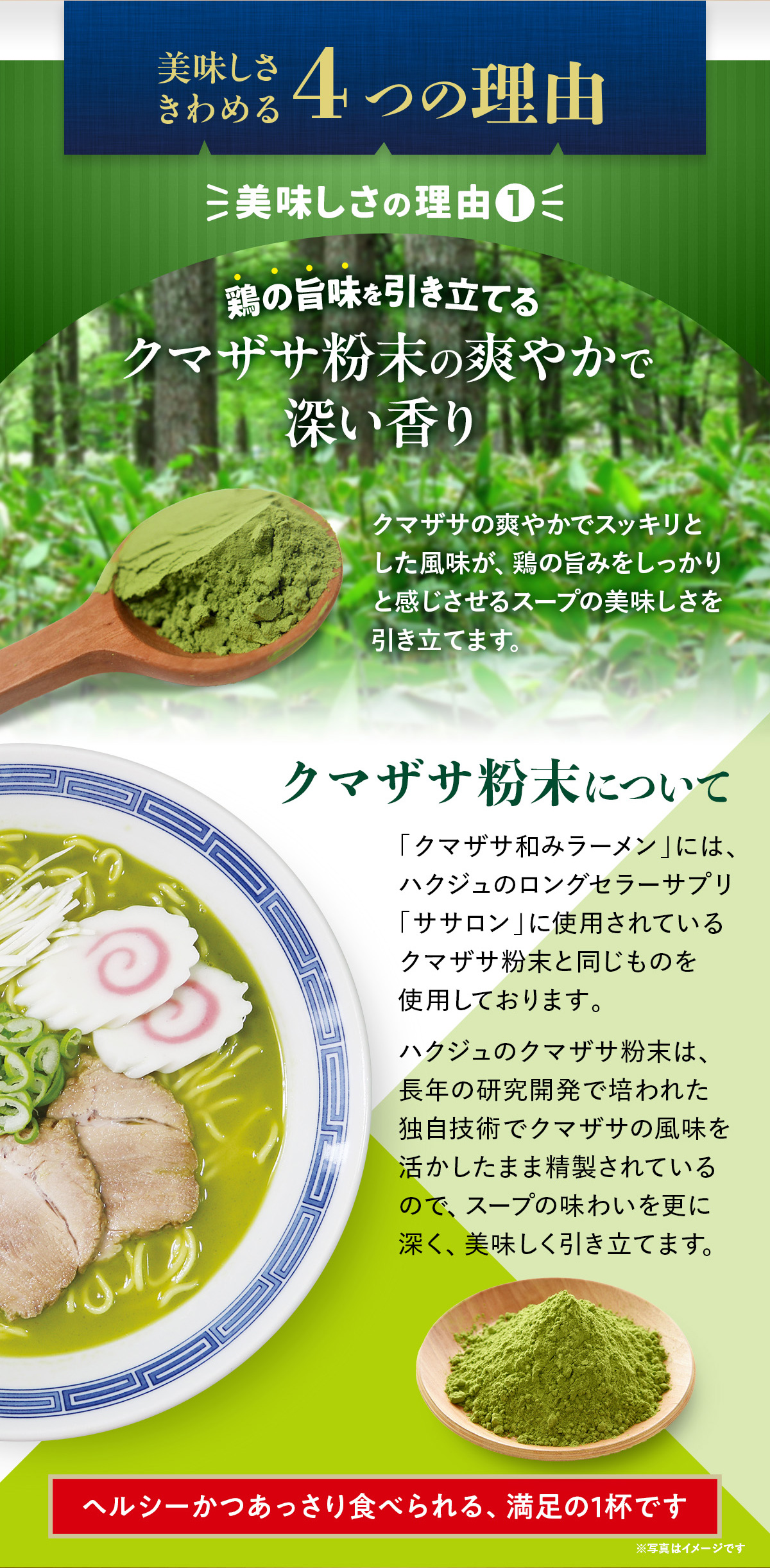 さらに、「クマザサ和みラーメン」には、 ハクジュのロングセラーサプリ「ササロン」に使用されているクマザサ粉末と同じものを使用しています。