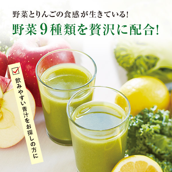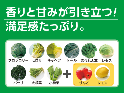 | 原材料 | ブロッコリー、セロリ、キャベツ、ケール、ほうれん草、レタス、パセリ、大根葉、小松菜、りんご(国産・チリ産)、レモン/クチナシ色素 ※砂糖・食塩不使用。 ※原材料由来の糖類が含まれています。 食物アレルギー特定原材料等: りんご |